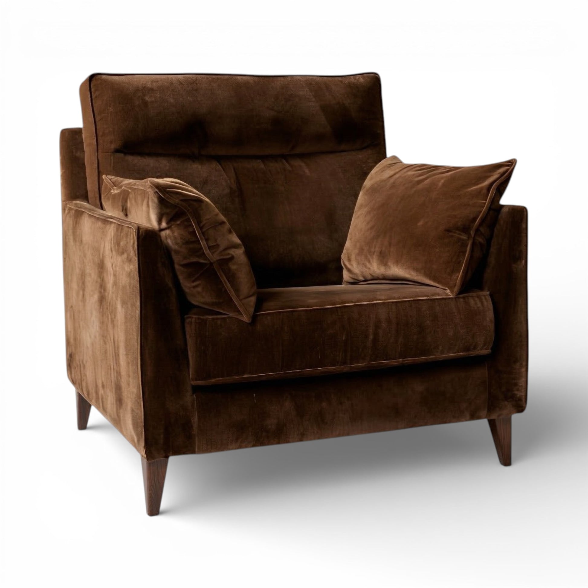 The Amelia Sofa features a high, supportive back with a split cushion design for ergonomic support. The armrests are contoured and include fibre-filled arm cushions finished with piping detail.