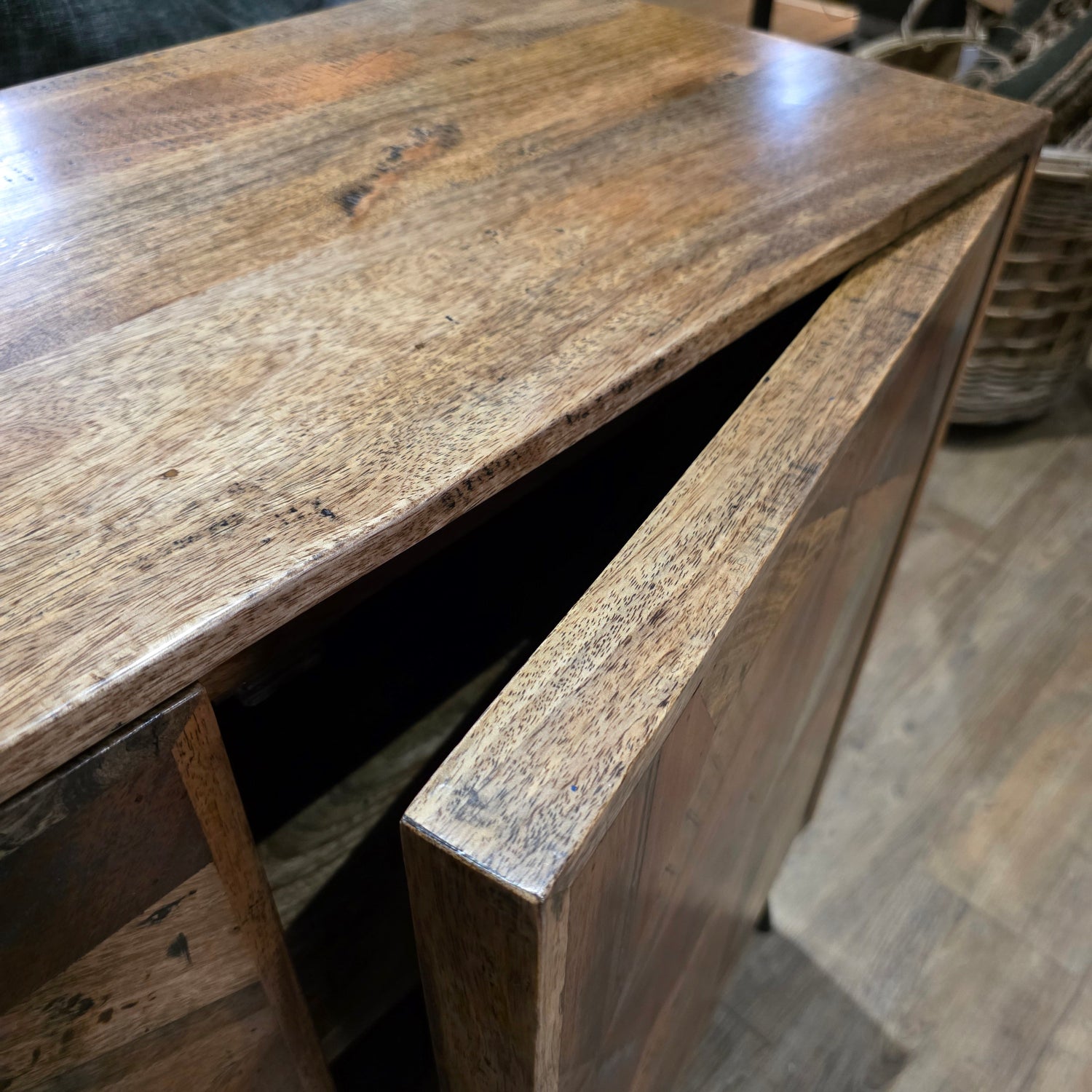 Part of the Morpho range, this four-door sideboard is constructed from reclaimed wood and features a geometric front design. Each piece has natural variations in tone and texture due to the reused timber. The sideboard stands on metal legs and includes a single central internal shelf for practical storage on each section.