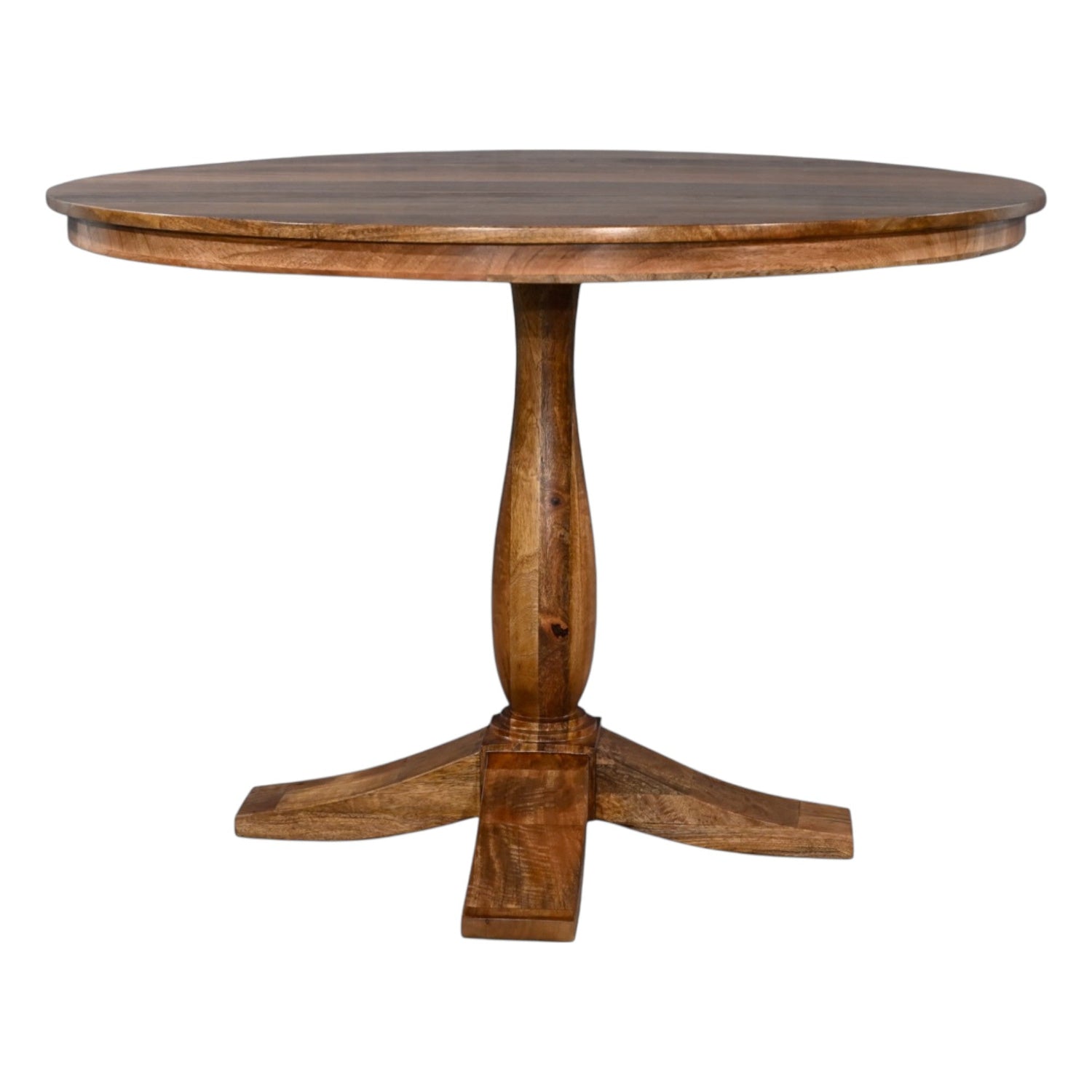 The Natalia Round Dining Table is crafted from solid mango wood with a rich, warm finish. The round tabletop sits atop a smoothly shaped central pedestal base, with four gently curved feet for added stability.