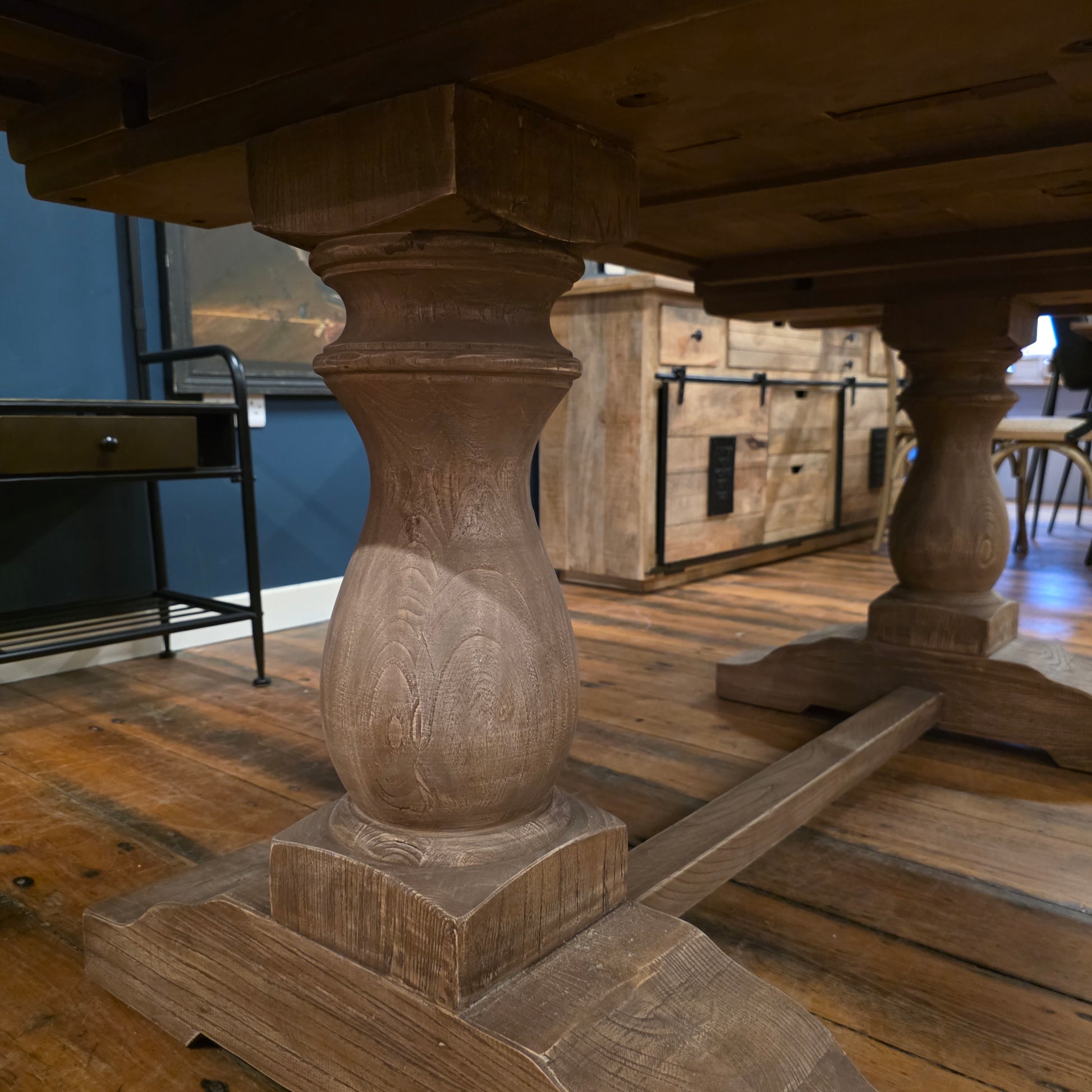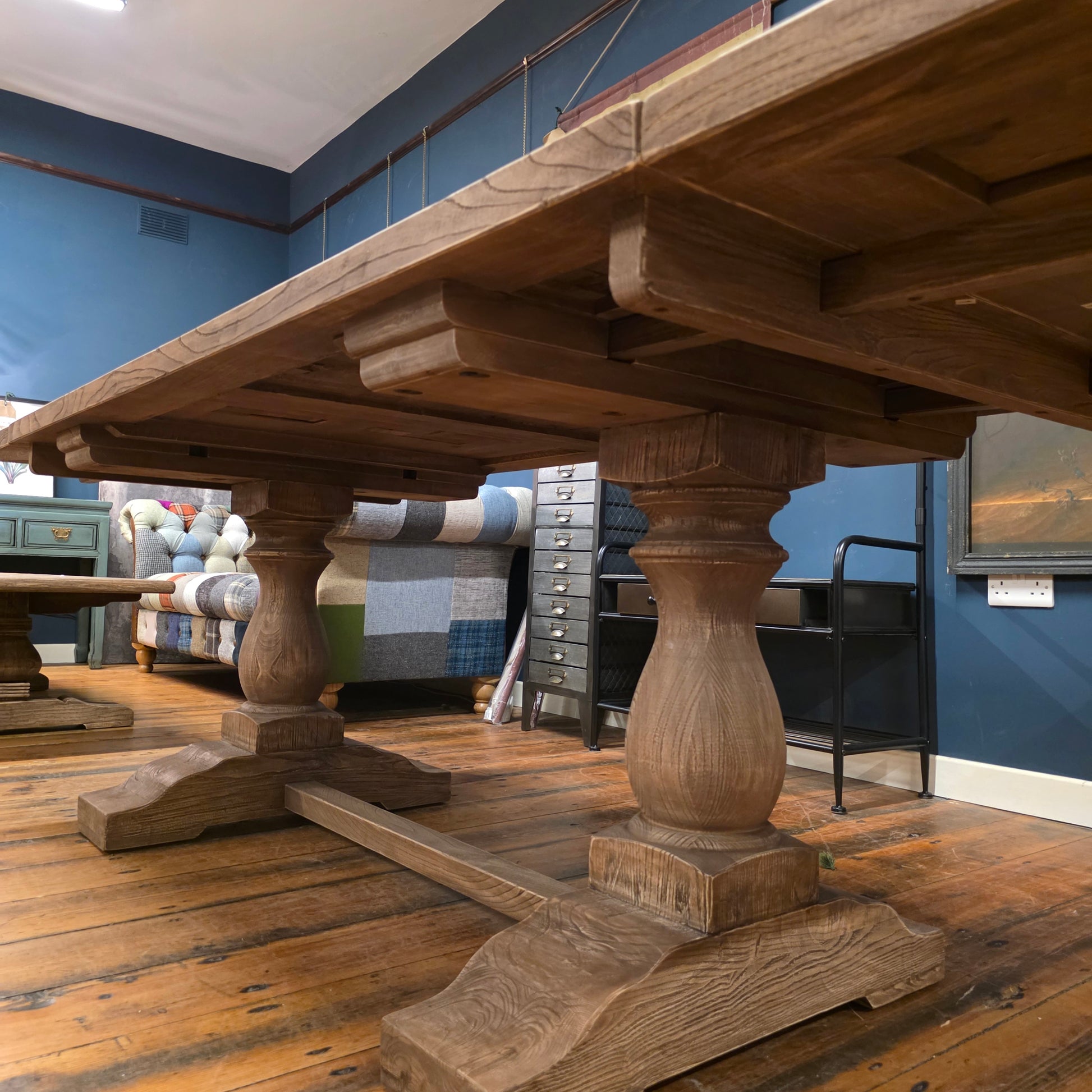 The Oyster Elm Extending Dining Table is a versatile and elegant dining piece made from reclaimed elm wood. Its robust rectangular top highlights the natural grain and character of the elm, supported by two baluster-style pedestal legs connected with a central stretcher for added strength and stability. Designed with both beauty and practicality in mind, this table extends smoothly to accommodate larger gatherings.