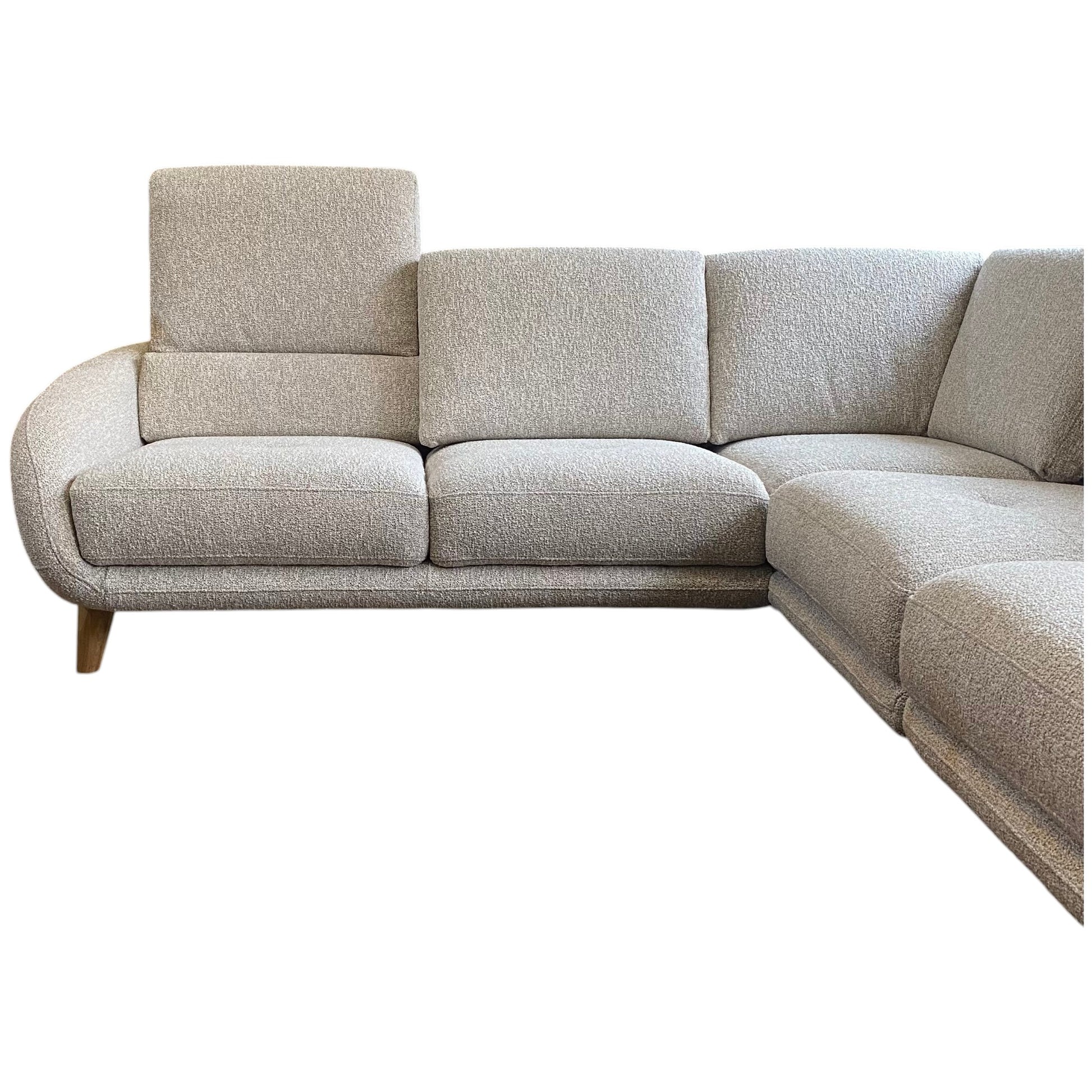 This Portobello Corner Sofa is upholstered in an easy-clean soft grey boucle fabric. Featuring fixed foam seat cushions with a fibre wrap and adjustable foam filled back cushions. Finished with light oak feet.