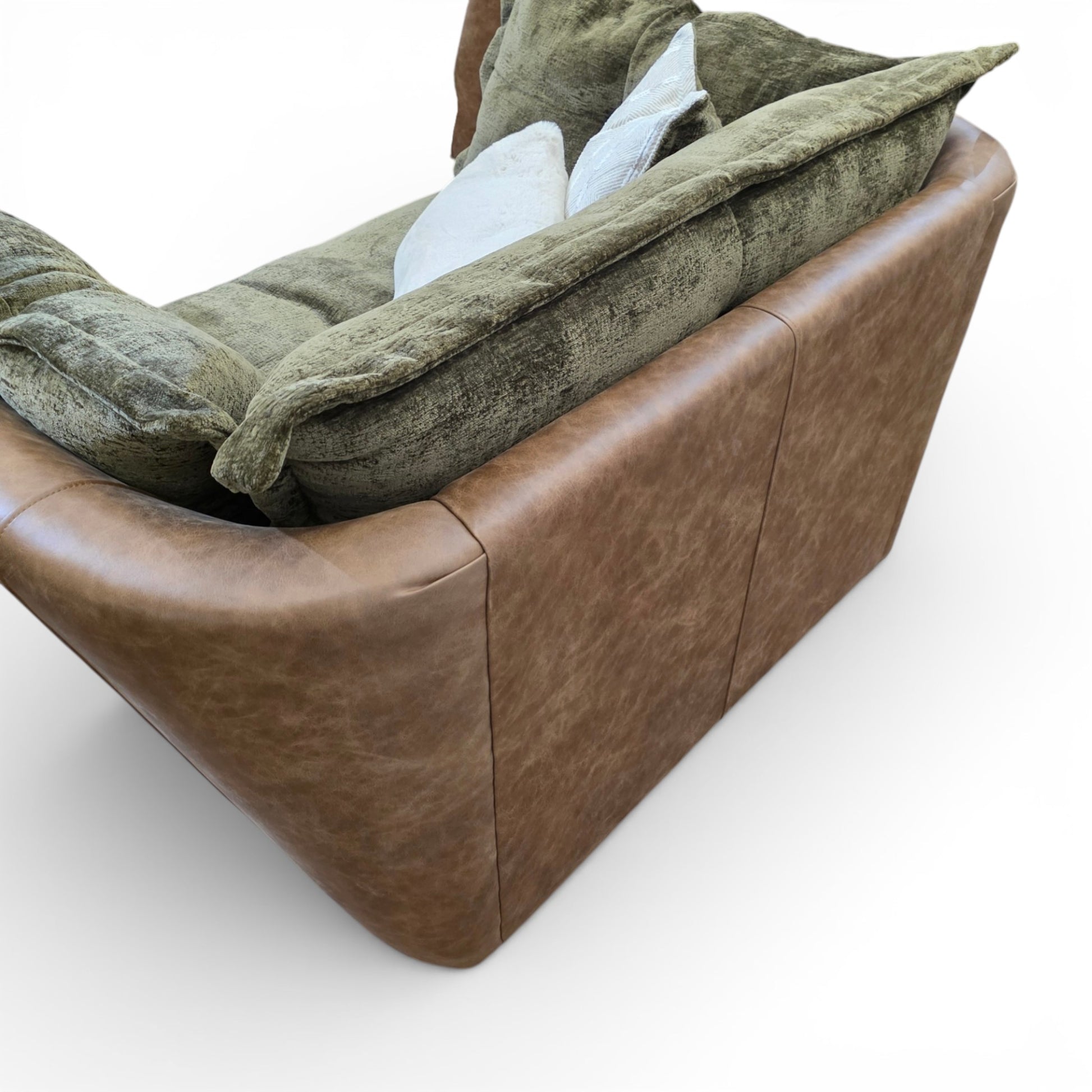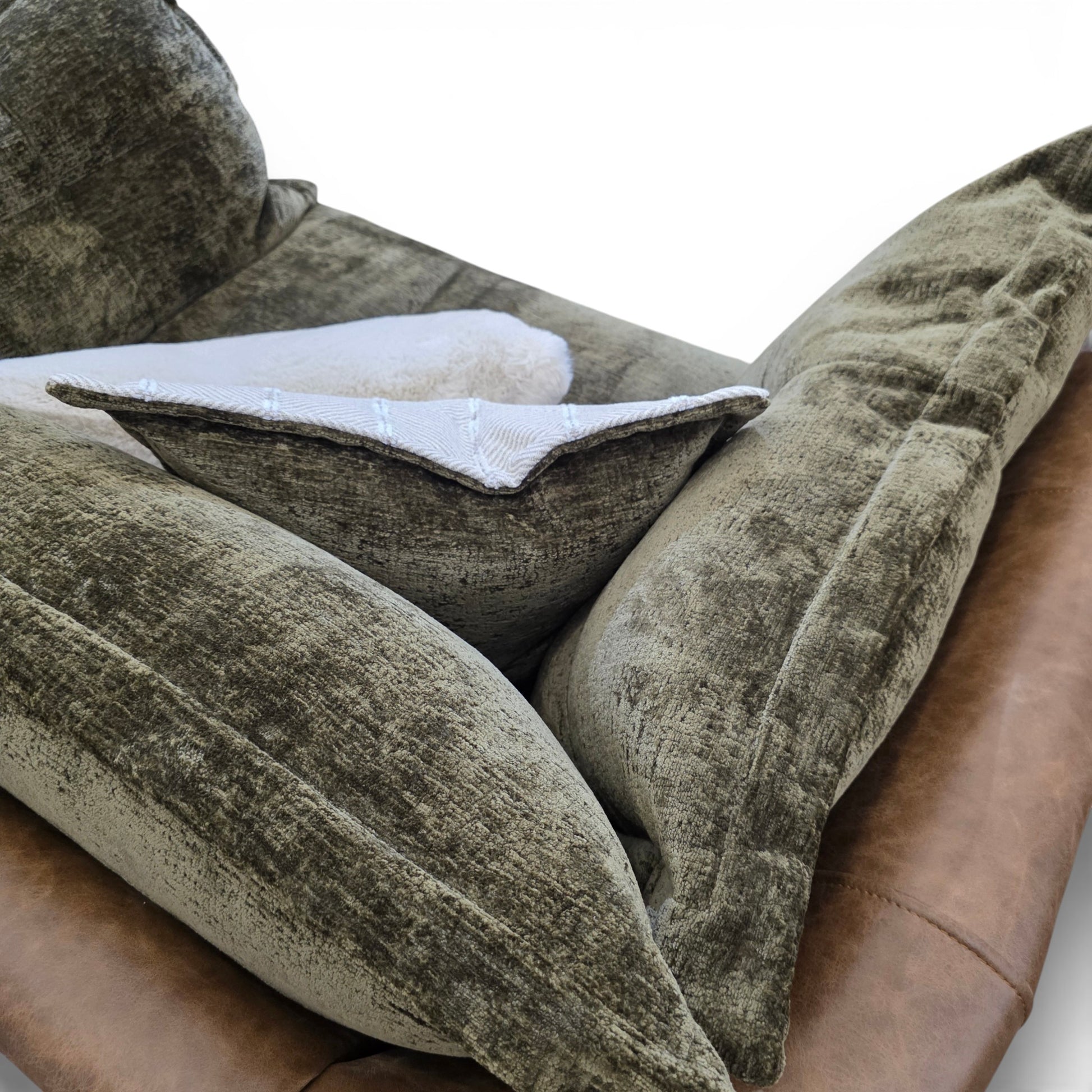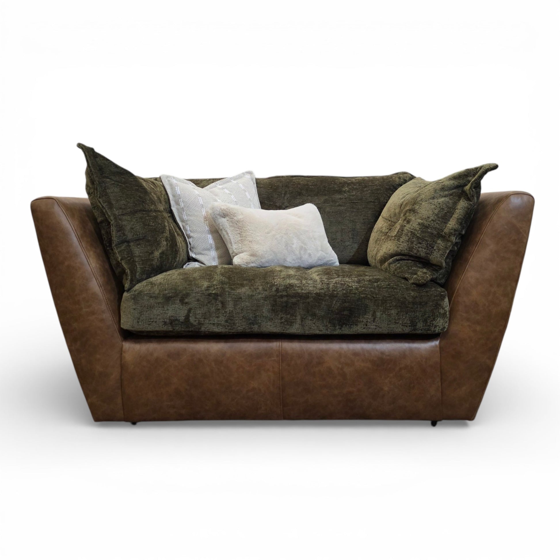 The Ruben Duo Love Chair features a frame that is dowelled, glued, screwed, and stapled for structural support. It includes serpentine seat springs and silent wire, with elasticated webbing in the back. The seat interior consists of a high-density Feather flex foam base topped with a channelled duck feather layer. Back cushions are fibre filled, and the scatter cushion is feather filled. feather-filled.