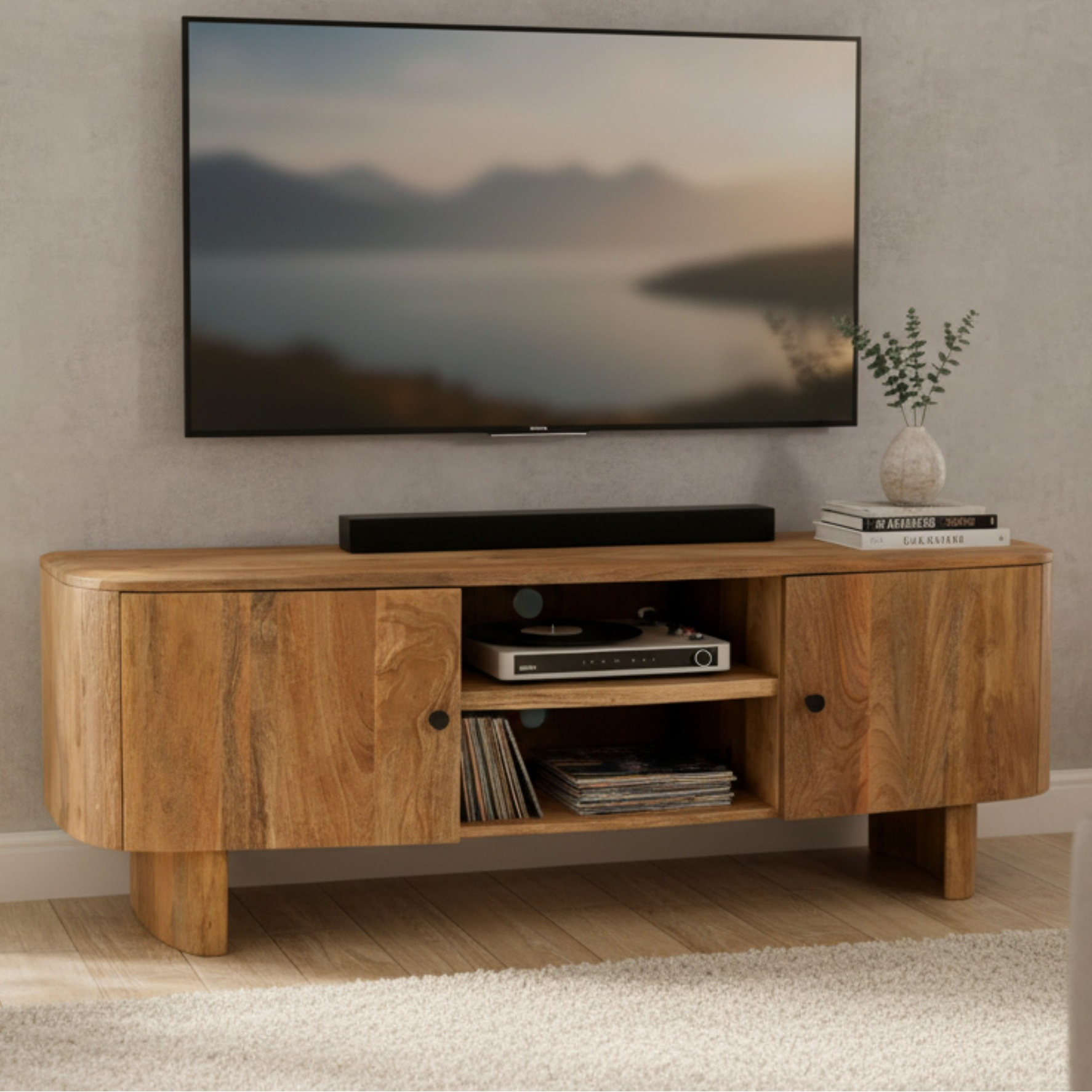 The Soren Large TV Unit has a gently curved silhouette with a bowed front and chamfered edges. Featuring two cupboards and two shelves for ample storage space for all devices. Supported by two sturdy curved panel feet. Crafted from solid mango wood in a natural finish.