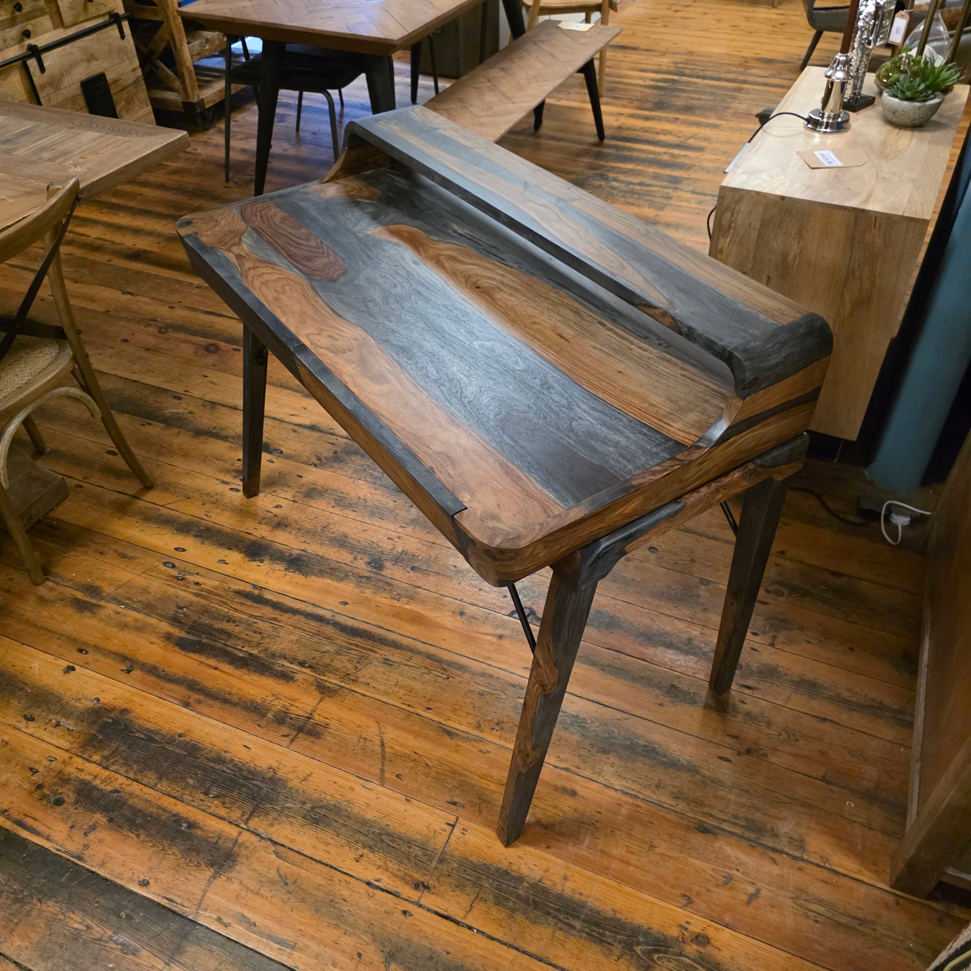This Stopa 2 drawer study desk is constructed from solid Sheesham wood and metal leg braces, complemented by a two-tone finish. The design blends natural wood grain with a sleek grey tone.