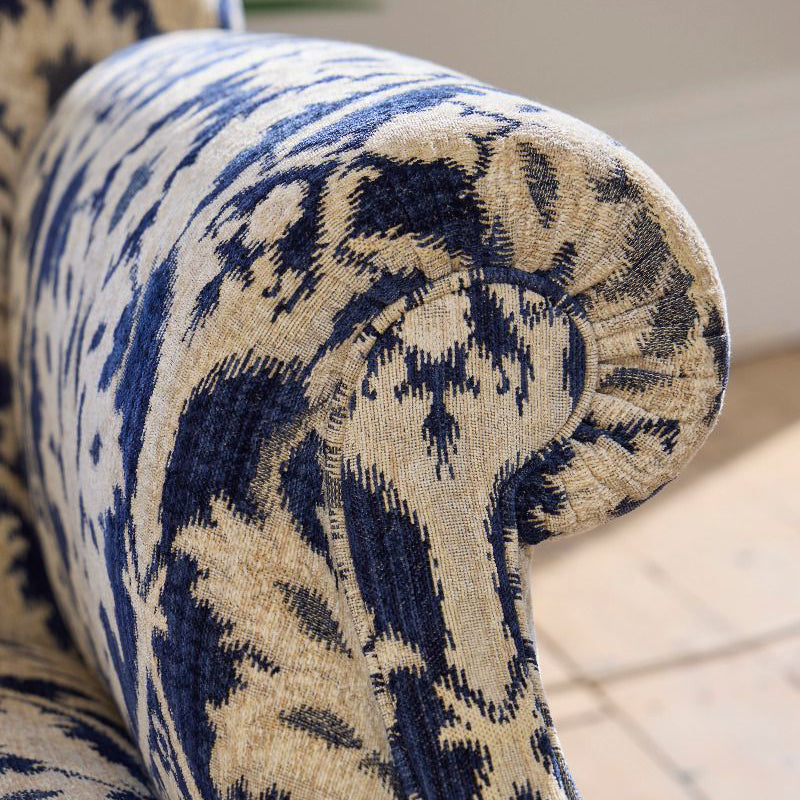 The Tallis Grand Sofa is a Victorian-style high-back chesterfield upholstered in Enigma chenille. The Enigma fabric has been part of the Heritage range for over 25 years and is available in Olive, Sage, Claret, Indigo, and Natural.