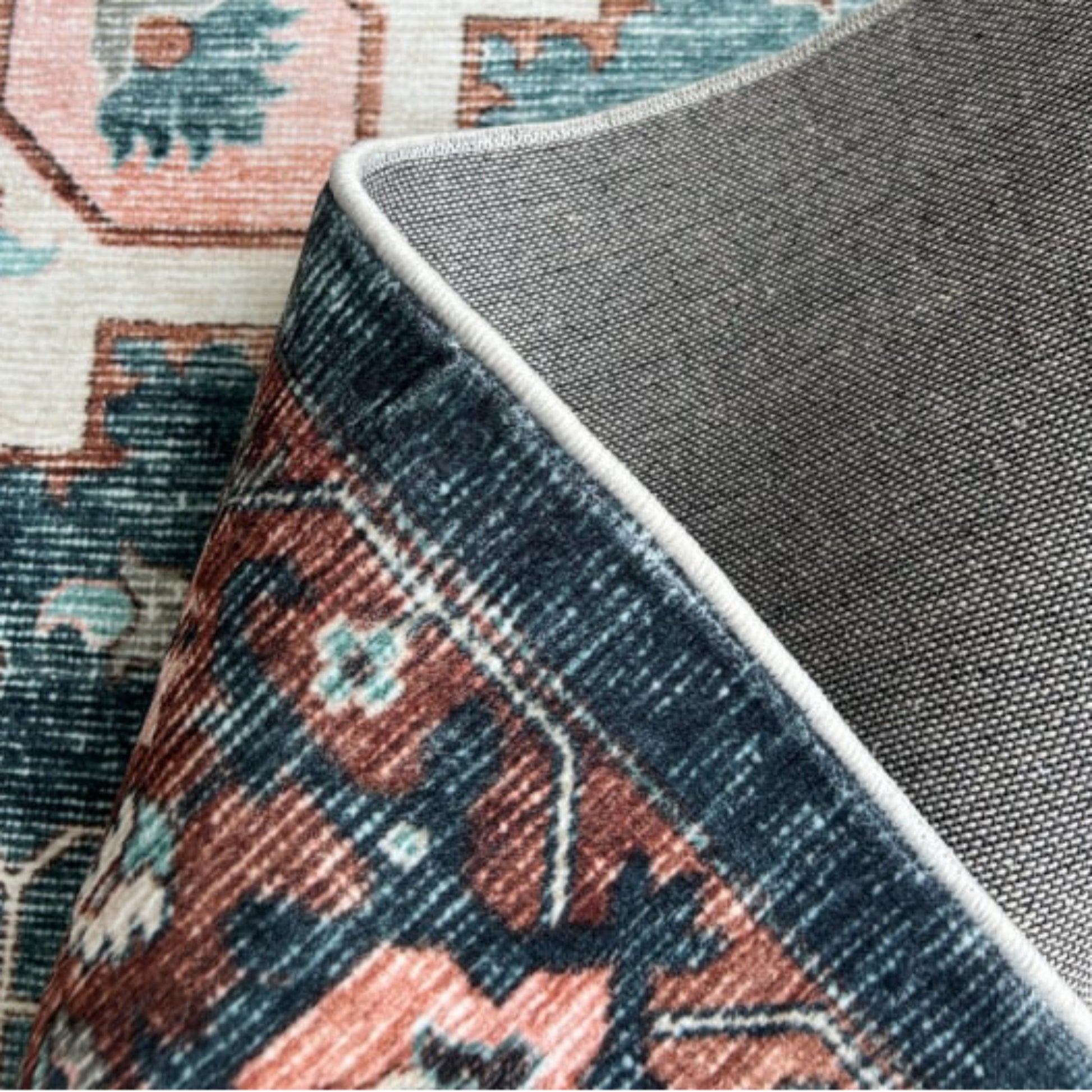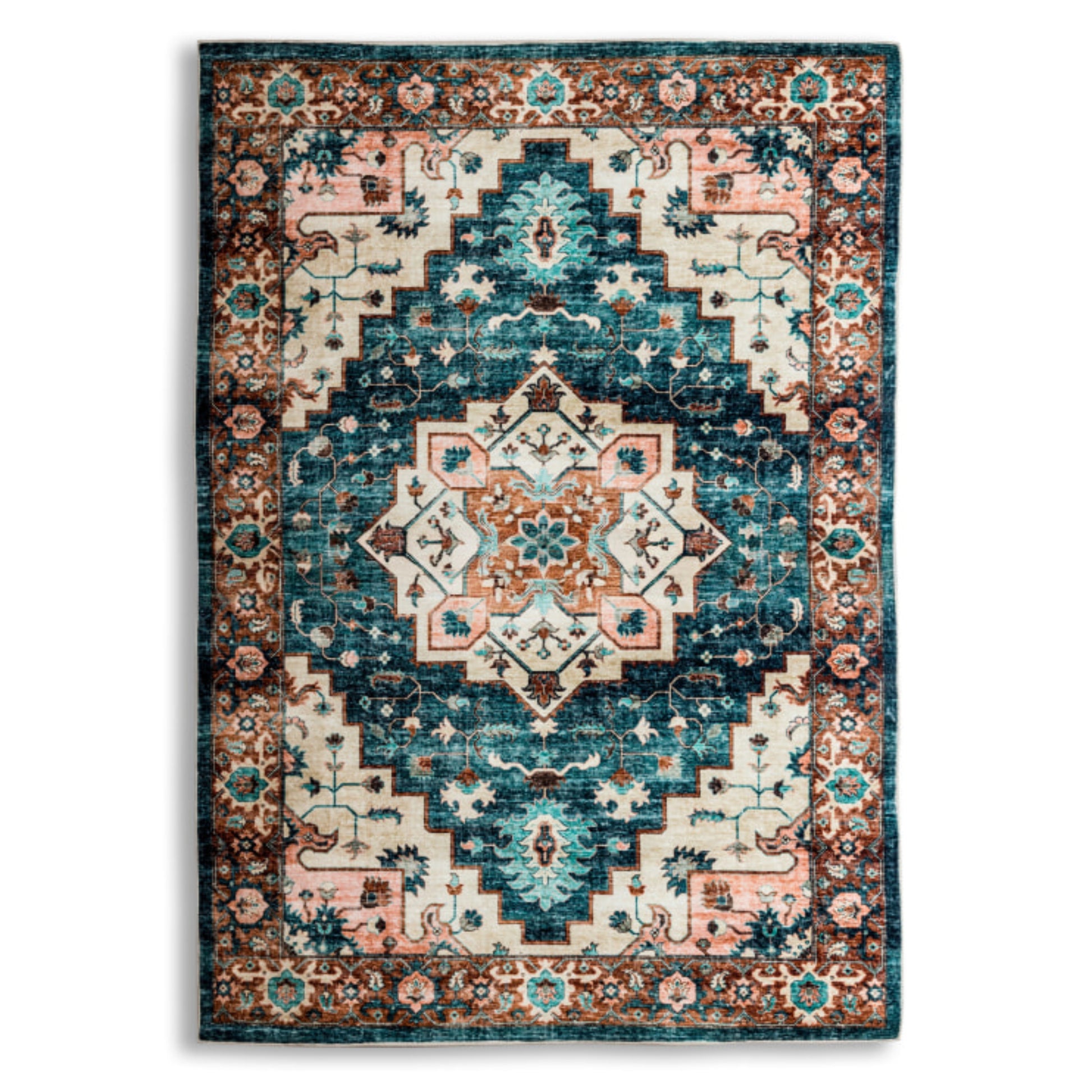 Traditional Teal & Terracotta Persian-style rug measuring 230cm x 160cm, featuring a central geometric medallion design with a patterned border. Finished with decorative tassels at each end for a classic look.